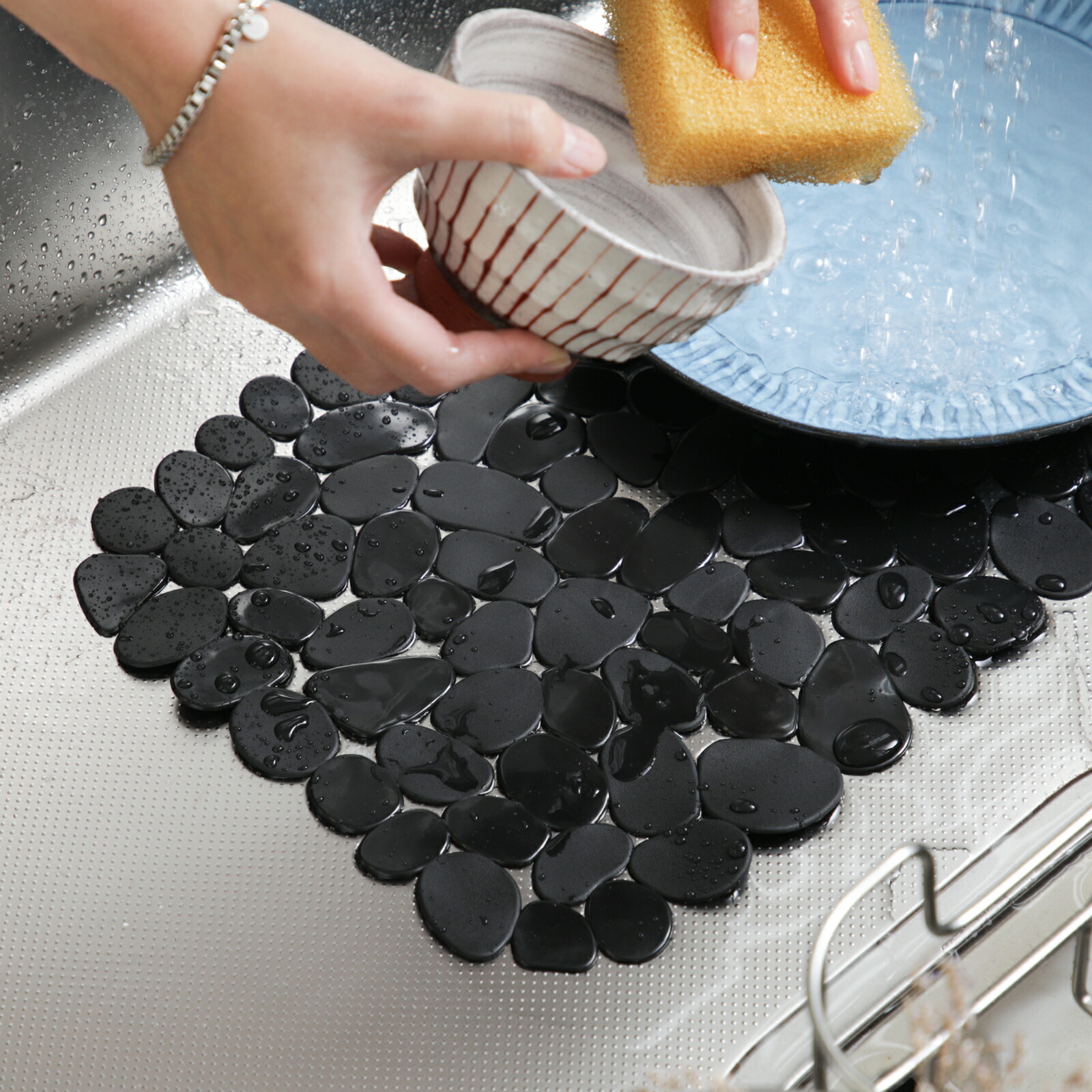 丈夫で摩耗やひっかきに強く、湿気や腐食耐性のあるPVC(ポリ塩化ビニール)のシンクマットです。シンクを衝撃から守り、傷やダメージを防いでくれます。シンク内で調理器具や食器が滑らないように安定させたいときにも便利です。お好みのサイズにカットして、花瓶などのインテリアオブジェの敷物にして家具に傷がつくのを防ぐことにも使えます。玉砂利のようなデザインでブラックとクリアの2色から選択できます。