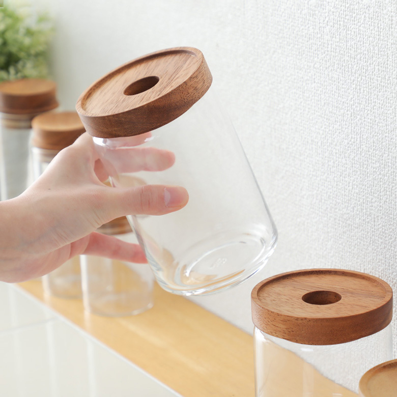 茶褐色の木目が美しいアカシアの木を使ったガラスキャニスター。蓋の上部に穴は指をかけて開けやすくしてあり、縁があるので重ねることもでき使い勝手も抜群。