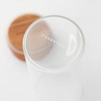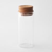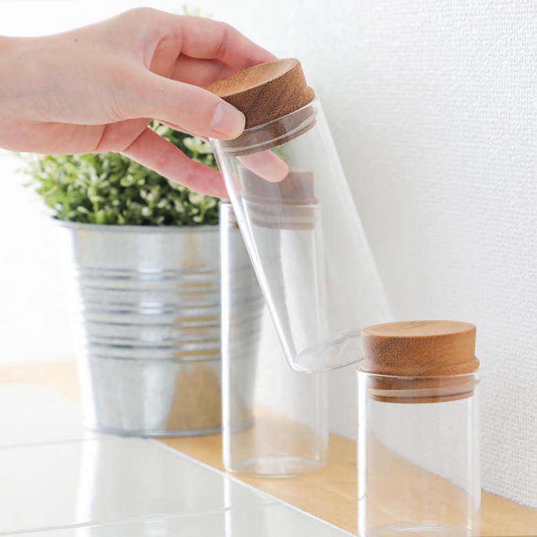 茶褐色の木目が美しいアカシアの木を使ったガラスキャニスター。蓋の上部に穴は指をかけて開けやすくしてあり、縁があるので重ねることもでき使い勝手も抜群。