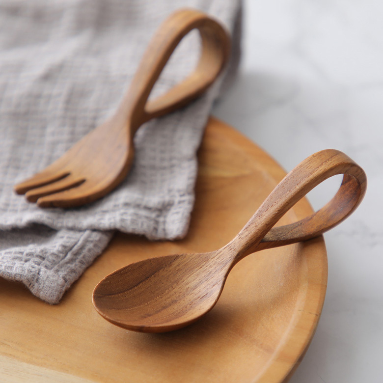 食べ口がきちんと薄くつくられており、口当たりがスムーズ。デザイン性も高く、木材でありながらどこかスタイリッシュな雰囲気。子供用もかわいい。