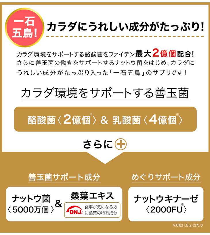 | リンゴ繊維(りんごを含む)(ドイツ製造)、マルトデキストリン、イソマルトオリゴ糖粉あめ、混合菌末(乳酸菌、酪酸菌)、桑葉エキス末(桑葉エキス、デキストリン)、ナットウキナーゼ末(ナットウキナーゼ、マルトデキストリン)、ナットウ菌、ヒアルロン酸、タマネギ外皮エキス末/セルロース、糊料(メチルセルロース)、二酸化ケイ素、グリセリン脂肪酸エステル |