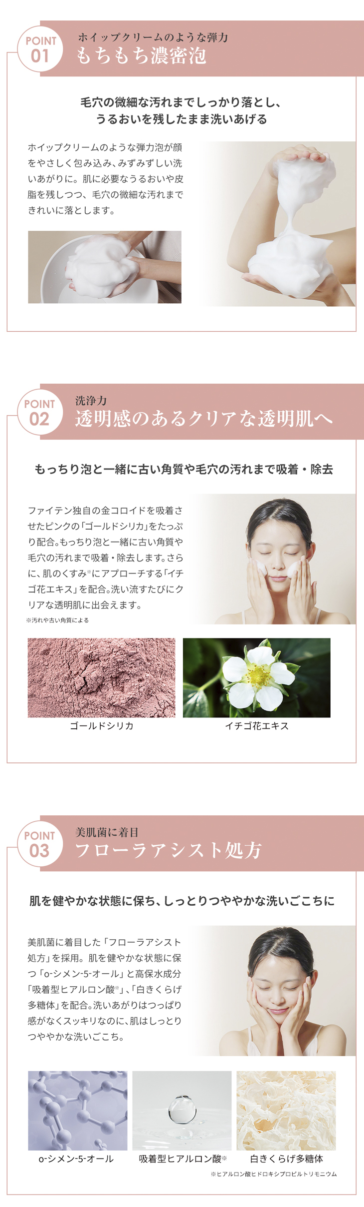 | 手のひらに適量(約2cm)をとり、水またはぬるま湯で泡立てます。顔全体を包み込むように洗った後、ていねいに洗い流してください。 |