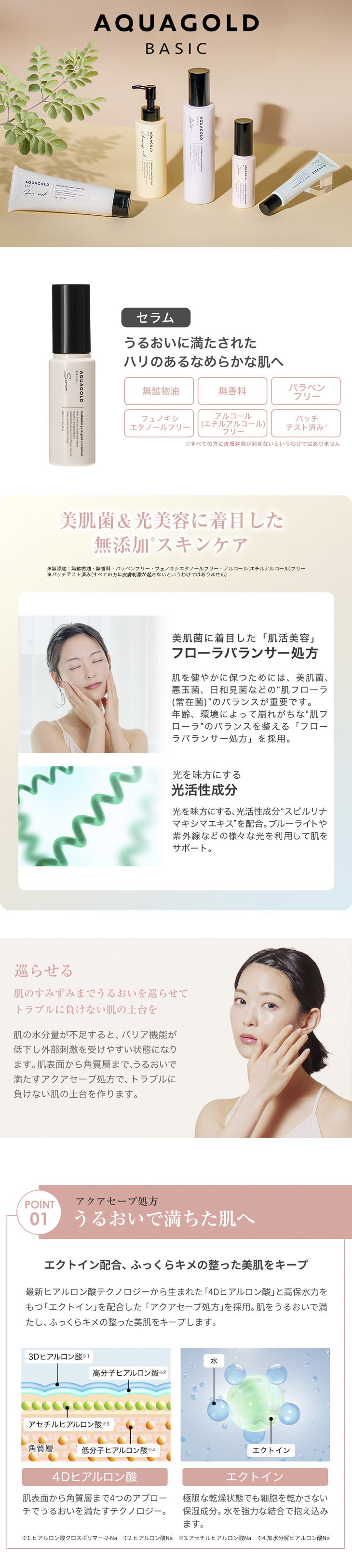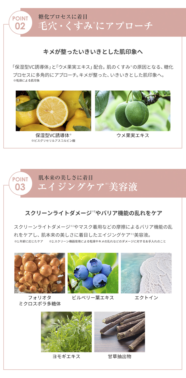 | 水、BG、PPG-24グリセレス-24、ペンチレングリコール、グリセリン、コロイド性金、コロイド性銀、スピルリナマキシマエキス、フォリオタミクロスポラ多糖体、α-グルカンオリゴサッカリド、グリコシルトレハロース、加水分解水添デンプン、エクトイン、ビフィズス菌培養溶解質、グリチルリチン酸2K、ヒアルロン酸Na、乳酸桿菌培養溶解質、アセチルヒアルロン酸Na、ビスグリセリルアスコルビン酸、セイヨウタンポポ葉エキス、ウメ果実エキス、ヒアルロン酸クロスポリマー-2-Na、ヨモギ葉エキス、加水分解ヒアルロン酸Na、ビルベリー葉エキス、プロパンジオール、アルギニン、(アクリレーツ/アクリル酸アルキル(C10-30))クロスポリマー、カプリルヒドロキサム酸、1,2-ヘキサンジオール、エチルヘキシルグリセリン、スクロース、レシチン |