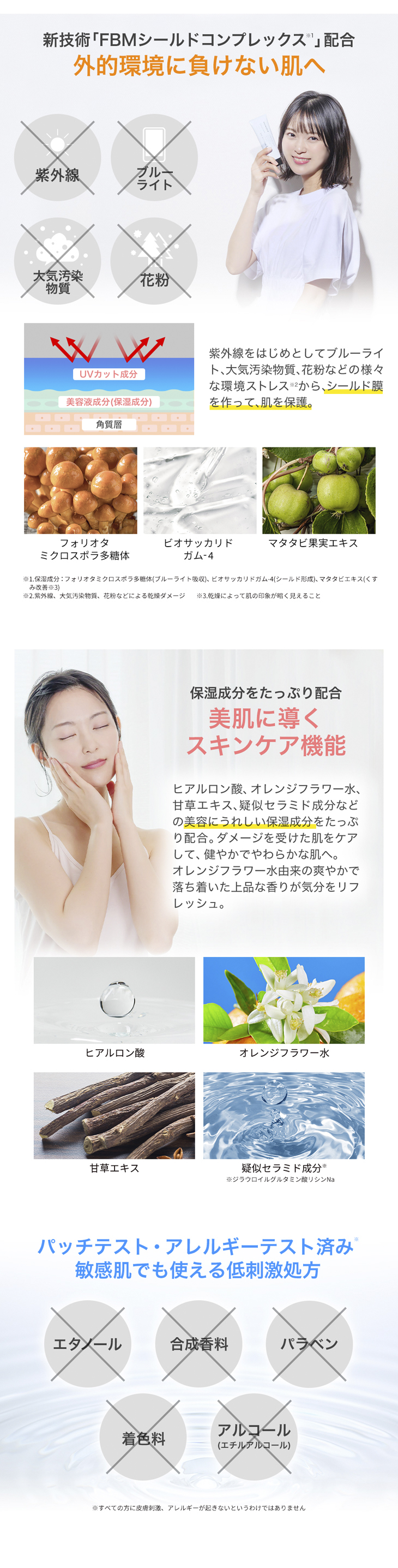| 水、メトキシケイヒ酸エチルヘキシル、酸化亜鉛、ジエチルアミノヒドロキシベンゾイル安息香酸ヘキシル、BG、(アクリル酸ヒドロキシエチル/アクリロイルジメチルタウリンNa)コポリマー、オレンジ花水、ビスエチルヘキシルオキシフェノールメトキシフェニルトリアジン、(カプリロイルグリセリン/セバシン酸)コポリマー、コロイド性金、グリチルレチン酸ステアリル、ジラウロイルグルタミン酸リシンNa、ビオサッカリドガム-4、ヒアルロン酸Na、フォリオタミクロスポラ多糖体、マタタビ果実エキス、ジメチロールプロピオン酸ヘキシル、ポリヒドロキシステアリン酸、トリエトキシカプリリルシラン、ポリソルベート60、BHT、フェノキシエタノール |