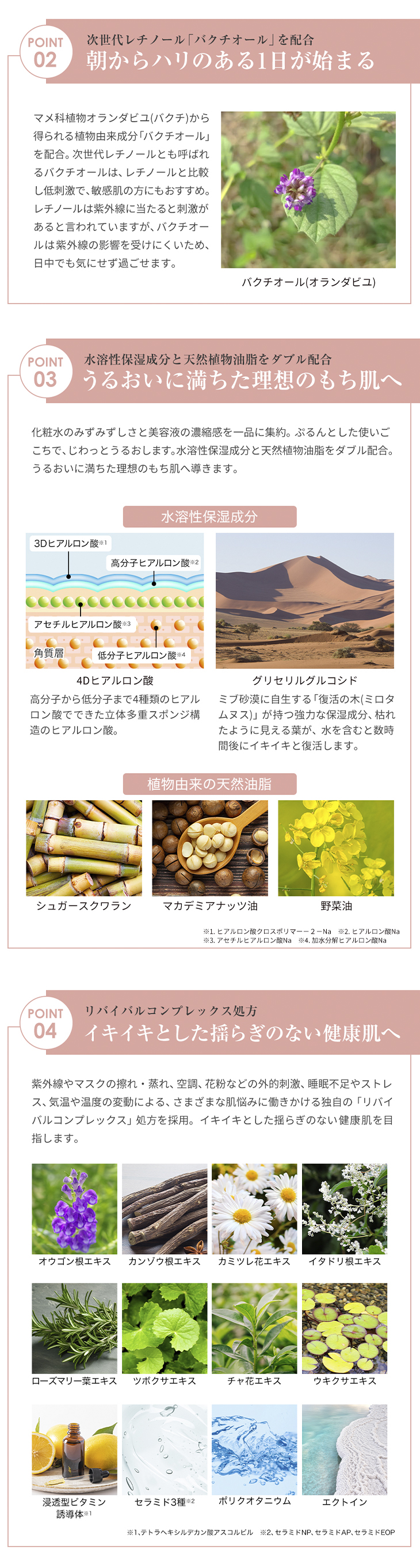 | 水、プロパンジオール、グリセリン、スクワラン、マカデミア種子油、野菜油、ペンチレングリコール、バクチオール、コロイド性金、コロイド性銀、スピルリナマキシマエキス、エクトイン、ビフィズス菌培養溶解質、乳酸桿菌培養溶解質、セイヨウタンポポ葉エキス、カンゾウ根エキス、チャ葉エキス、イタドリ根エキス、ウキクサエキス、オウゴン根エキス、カミツレ花エキス、ローズマリー葉エキス、ツボクサエキス、セラミドNP、セラミドAP、セラミドEOP、フィトスフィンゴシン、コレステロール、テトラヘキシルデカン酸アスコルビル、ヒアルロン酸Na、ヒアルロン酸クロスポリマー-2-Na、加水分解ヒアルロン酸Na、アセチルヒアルロン酸Na、グリセリルグルコシド、ベヘニルアルコール、ポリアクリレート-13、ペンタステアリン酸ポリグリセリル-10、(ビニルジメチコン/ラウリルジメチコン)クロスポリマー、BG、(アクリレーツ/アクリル酸アルキル(C10-30))クロスポリマー、ポリクオタニウム-51、カルボマー、キサンタンガム、レシチン、ステアロイルラクチレートNa、カプリルヒドロキサム酸、ポリソルベート20、イソステアリン酸ソルビタン、ポリイソブテン、スクロース、アルギニン、カプリリルグリコール、ラウロイルラクチレートNa、ラウリン酸ポリグリセリル-10、1,2-ヘキサンジオール、エチルヘキシルグリセリン |