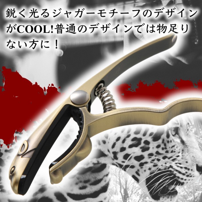 超希少!ジャガーモチーフカポタスト!小物だからと言って、あなたはカポタストを”なんとなく”で選んでしまっていませんか?当製品は簡単に脱着ができ、それでいて強力なグリップ力を発揮する、初心者から上級者の方にまで大満足頂ける自慢のカポタストです。ぜひ一度手に取り、使い心地を確かめてみて下さい。