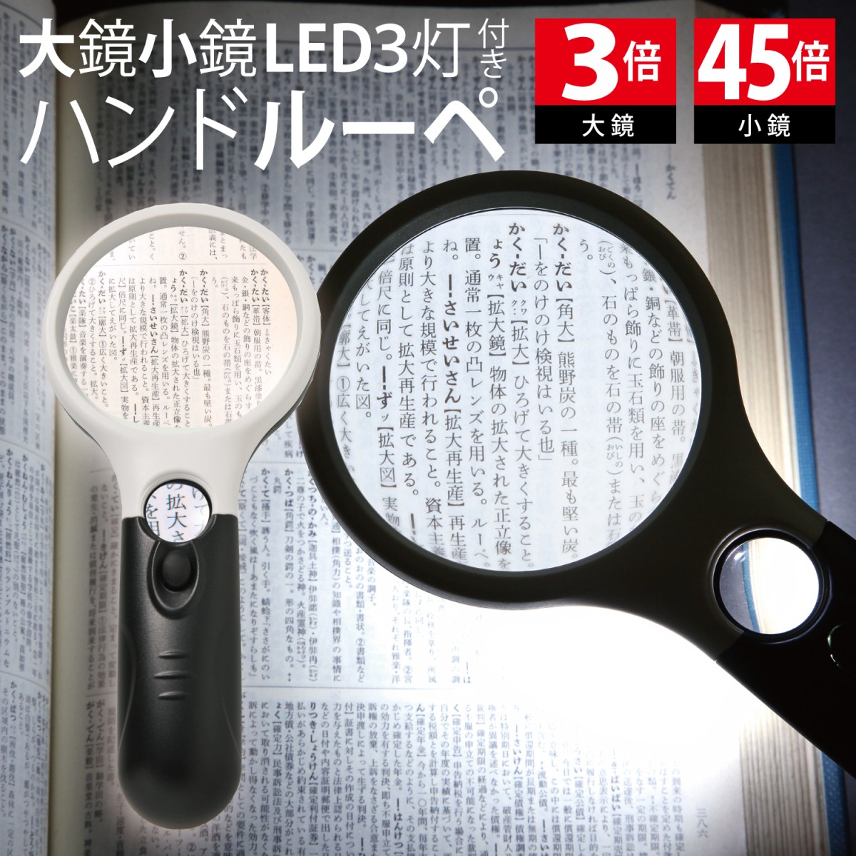 3倍でも45倍でもどちらを使用していてもよく見えます!LEDライトを掲載しており、読みにくい細かな文字まではっきりくきり視認性が格段にUPしちゃいます!(電池式単4×3)