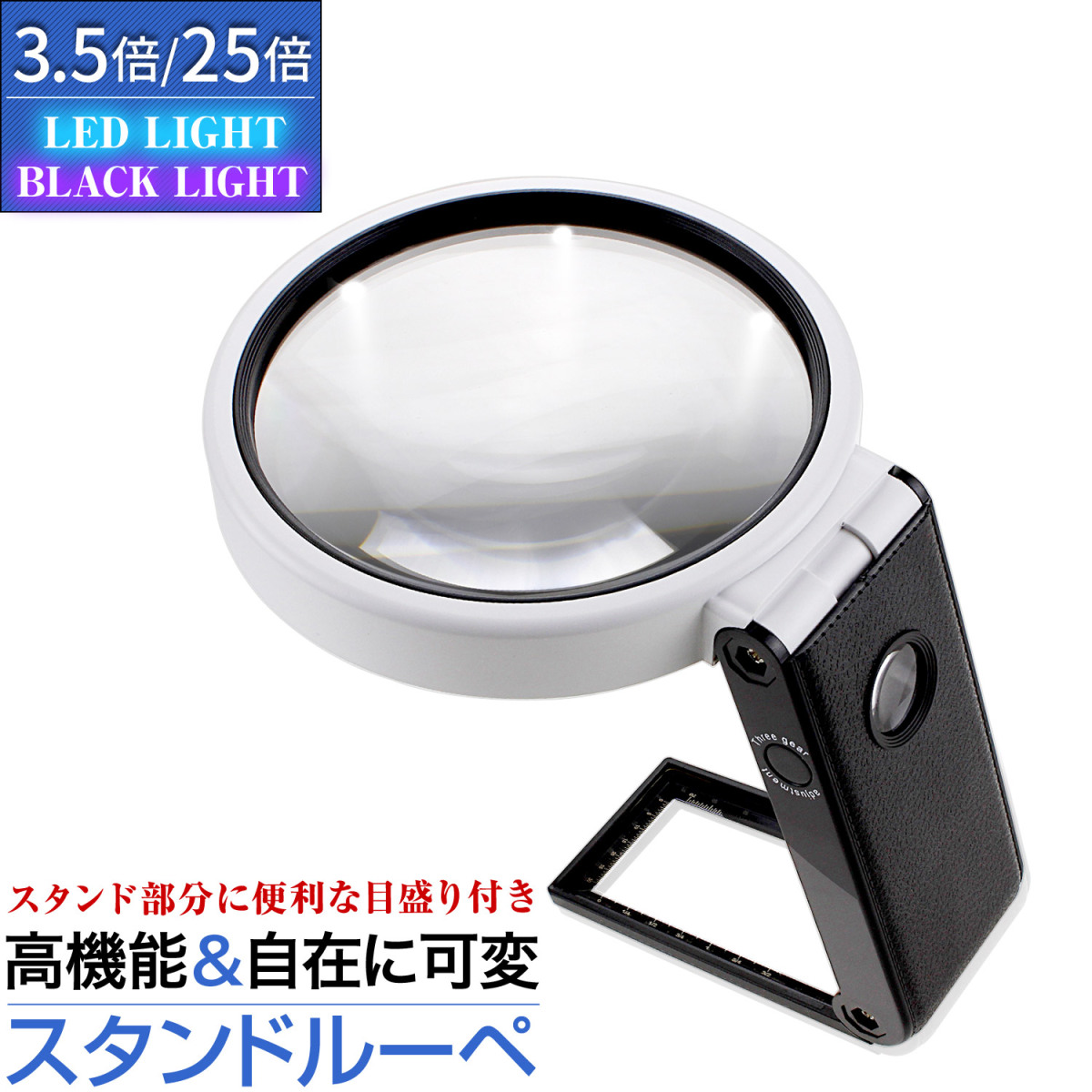 拡大鏡 ルーペ 手持ち スタンドルーペ 倍率3.5倍&25倍 2種類レンズ LEDライト 5灯 ブラックライトPhoenixLopue 老眼鏡 /スタンドルーペC