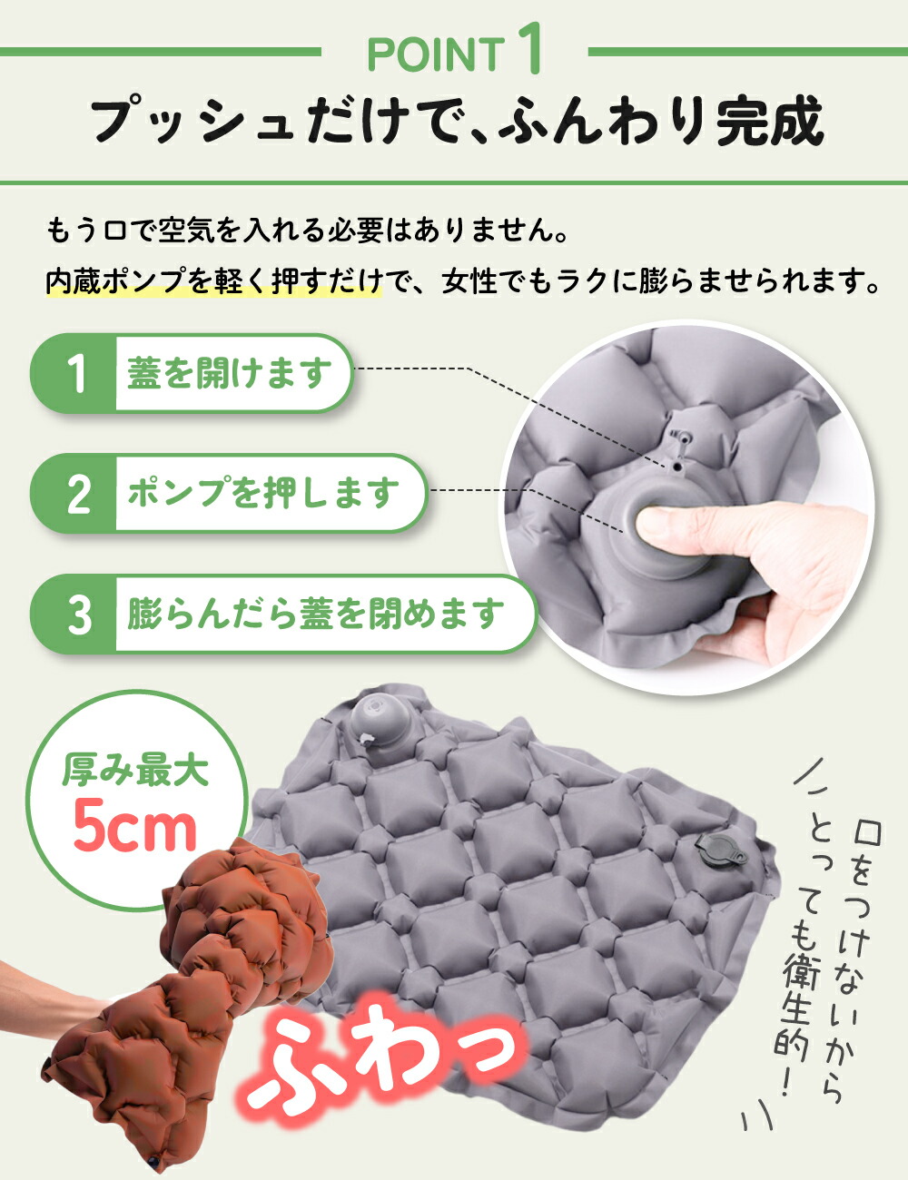 もう口で空気を入れる必要はありません。手のひらで軽くプッシュするだけで、短時間でふんわりとしたクッションが完成。