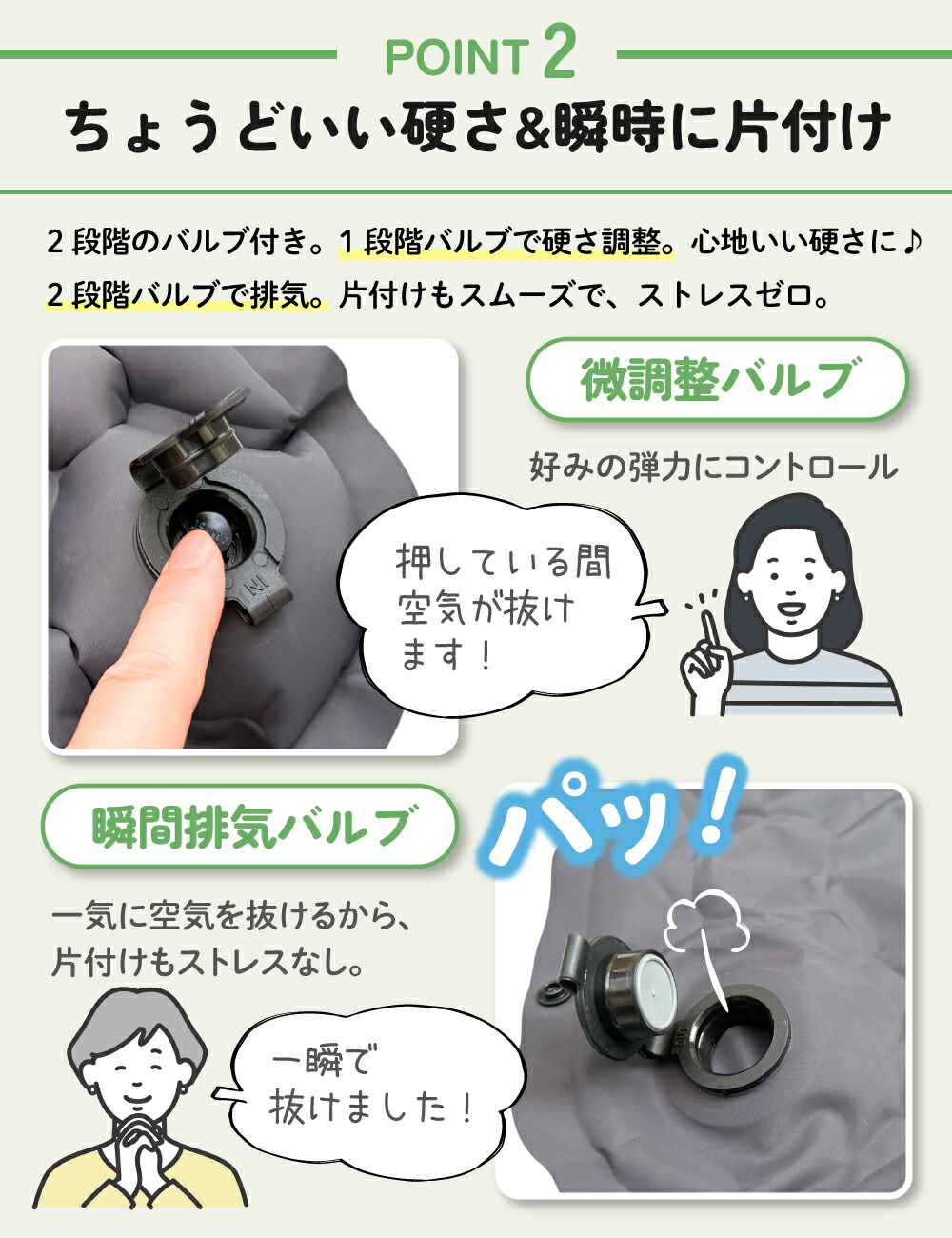瞬間排気バルブで一気に空気を抜けるから、片付けもストレスなし。