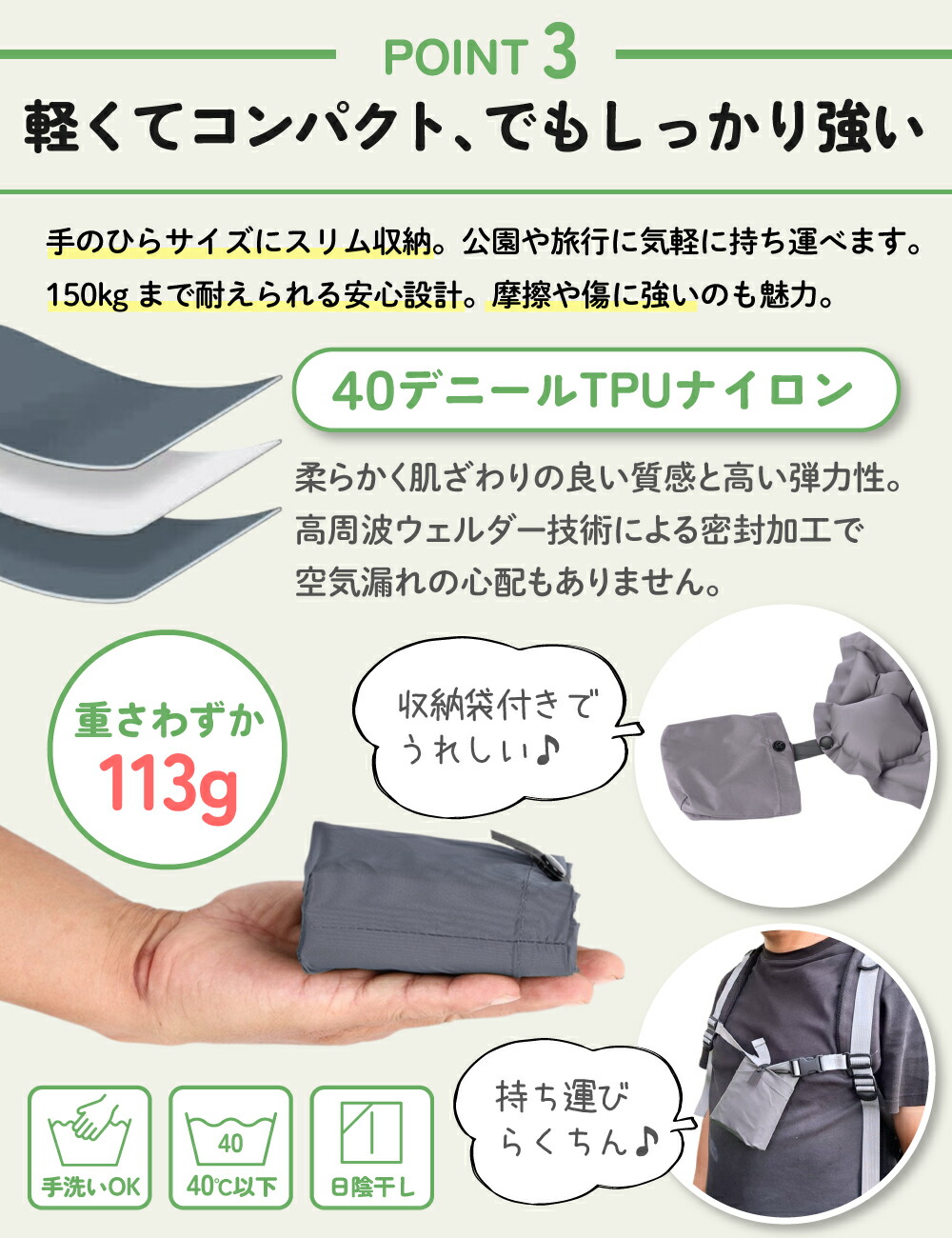 厚み最大5cmでしっかりとした座り心地を実現しながら、重さはわずか113g。折りたためば手のひらに収まるサイズになり、収納袋付きで持ち運びもスマートです。