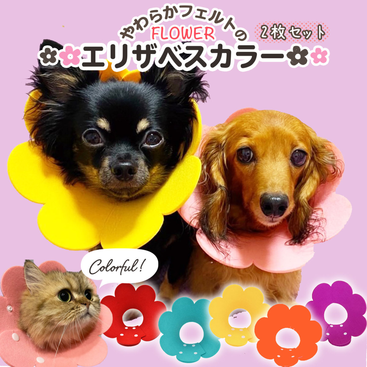 | 商品説明 | 猫ちゃんのストレス軽減!可愛いお花のエリザベスカラー 当店販売中の【ひまわりエリカラ】より筒形になっていますが、一般的な筒柄タイプより広めなので猫ちゃんのストレス軽減になります。 ひまわりエリカラでは患部に届いてしまう恐れがある場合はこちらがおすすめです。 フェルト生地なので、カラーの先端がぶつかっても衝撃が少なく、また素材が軽いのもおすすめポイント♪ ただでさえストレスなエリザベスカラー・・・少しでも快適に! フェルト生地のため洗えないので2枚セットでお届けいたします。 ボタンが両面で使えるのでリバーシブルで使用可能です。 ※被毛量を考慮してお選びください。 |