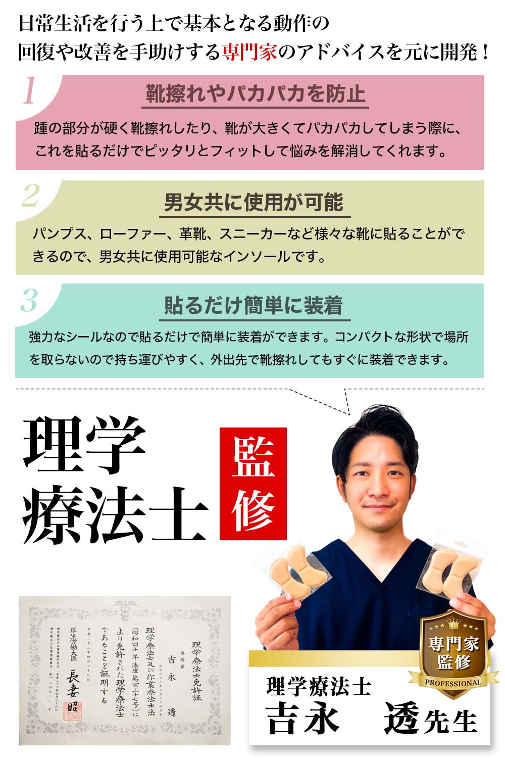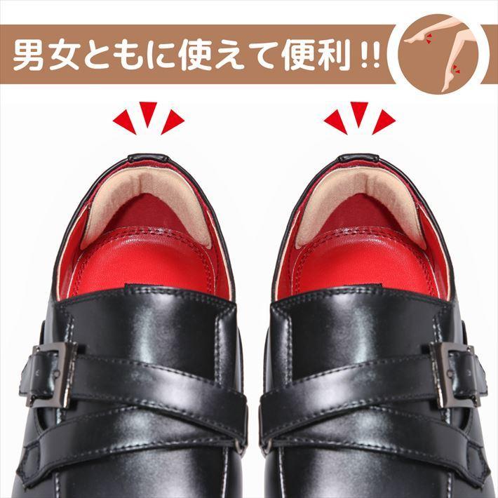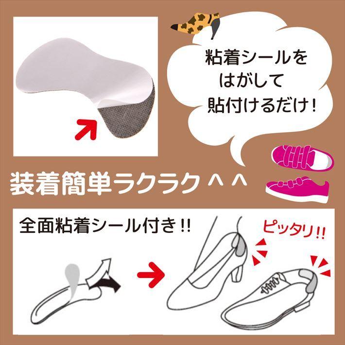 | 使用法(装着方法) | 1,本体に付いている粘着シールの保護シートを剥がします。 2,靴の踵部分に合わせて貼り付けて下さい。 (靴を履く際は、くつべらを使用して頂くことでさらにズレにくくなります) |