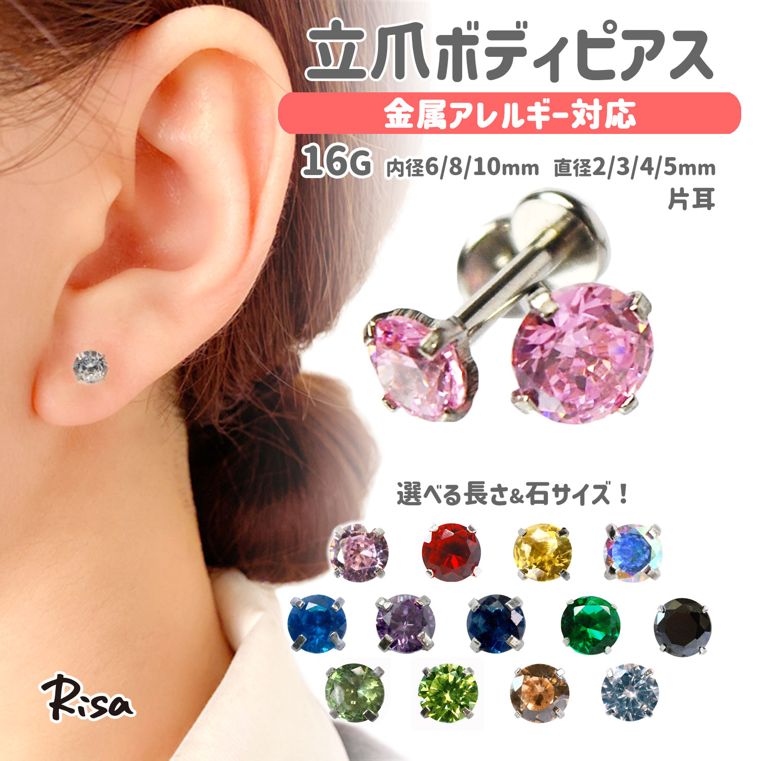 ボディピアス 16G 金属アレルギー 対応 サージカルステンレス 軟骨 立爪 ジュエル かわいい つけっぱなし ラブレット