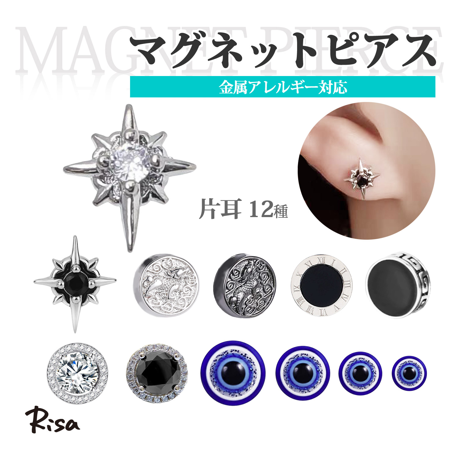 マグネットピアス ノンホールピアス 金属アレルギー対応 片耳 一粒ジュエル 目玉 ラウンド 龍 ローマ数字 ニッケルフリー メンズ レディース 穴あけ不要