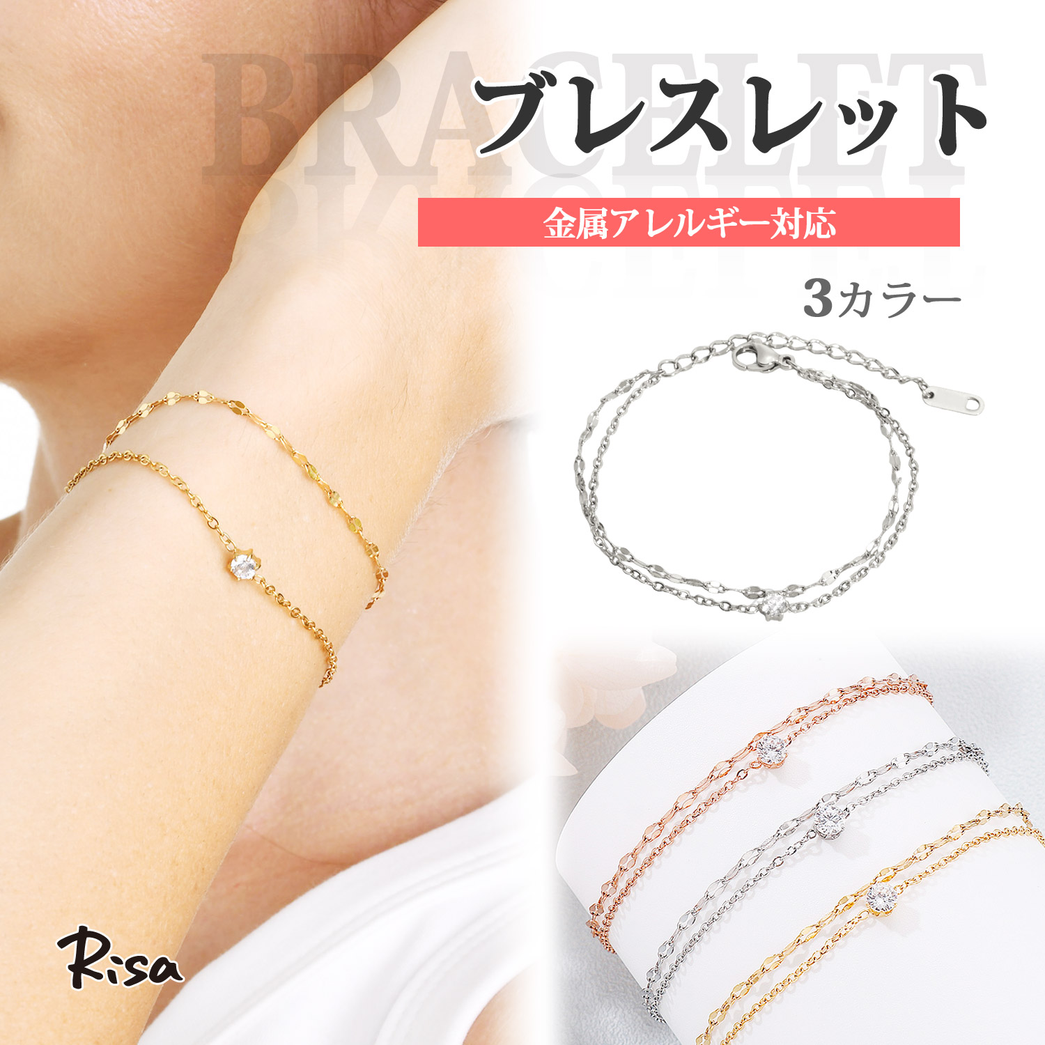 ブレスレット チェーン 金属アレルギー対応 サージカルステンレス 2連 一粒ジュエル ストーン エクレア ペタル レディース 華奢 大人
