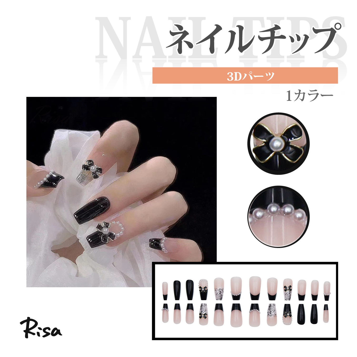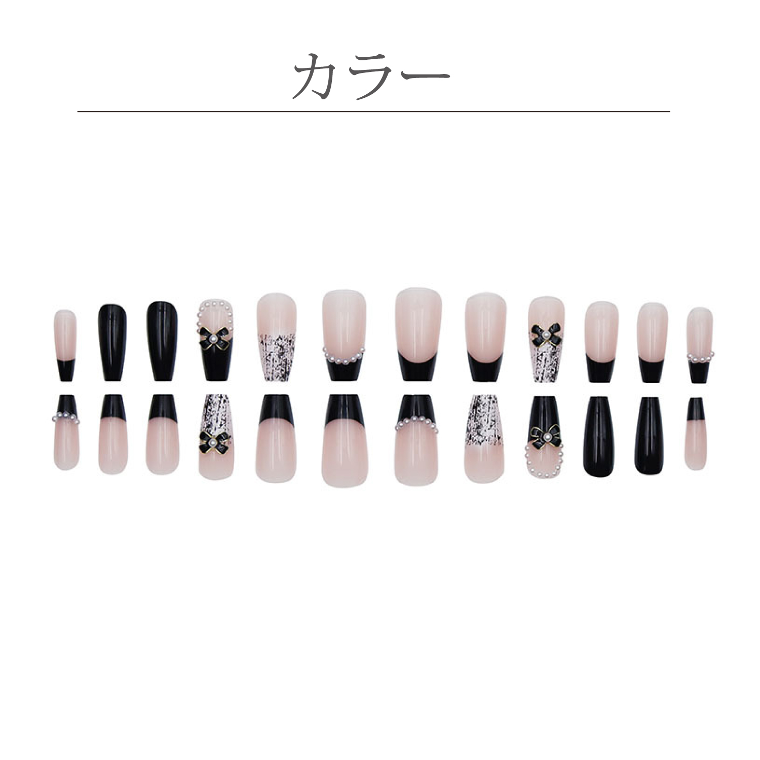 ネイルチップ 付け爪 チップ ロング 24枚セット グルー付 3Dアート パール ブラック ピンク リボン 時短ネイル 貼るネイル セルフ つけ爪 初心者