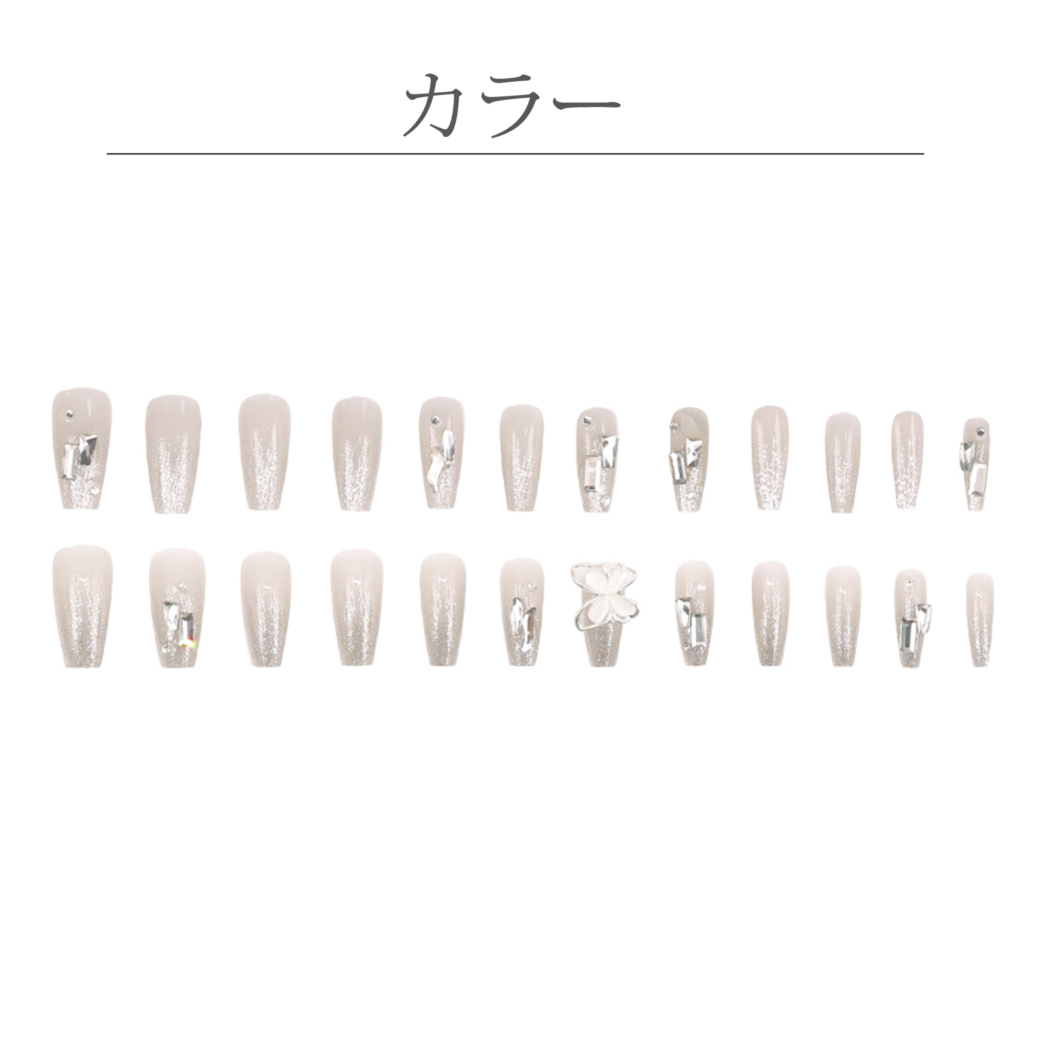 ネイルチップ 付け爪 チップ ロング 24枚セット グルー付 3Dアート 蝶 キラキラ ストーン ビジュー ラメ ホワイト 時短ネイル 貼るネイル セルフ つけ爪