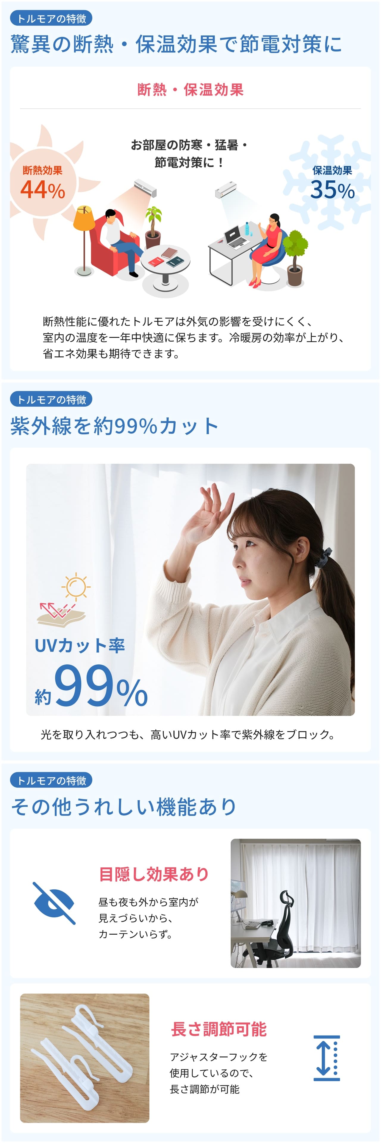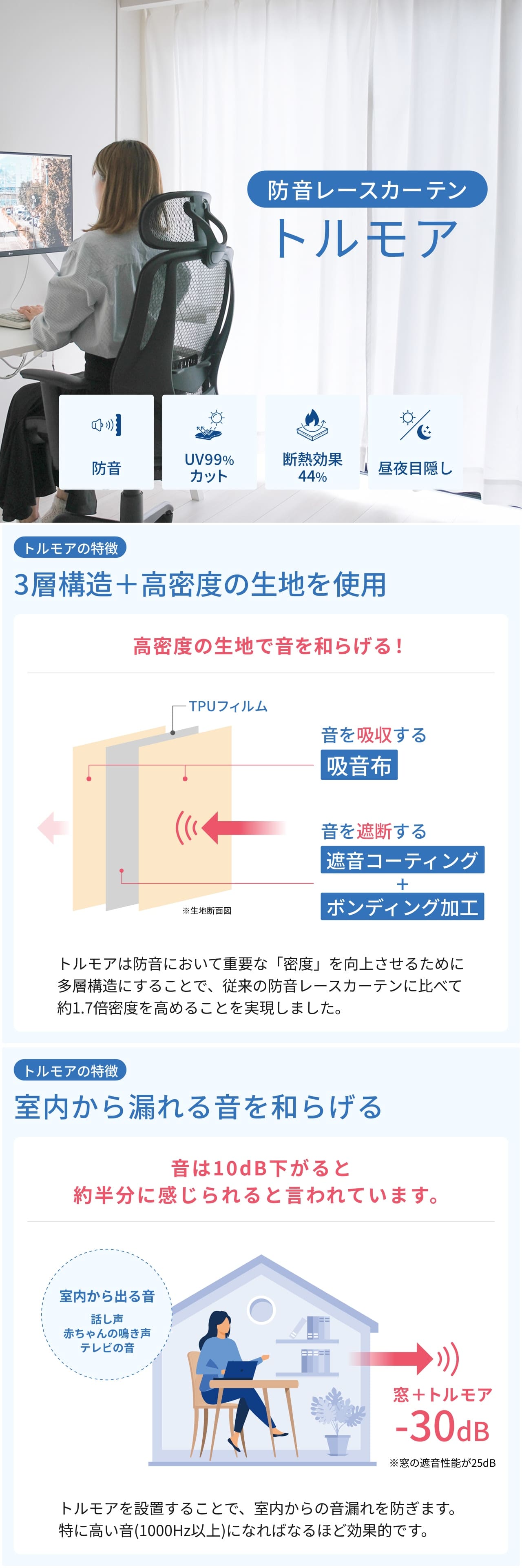 【特長】ウォッシャブル(液温40℃以下で手洗い)、遮音性、UVカット、遮熱、花粉ガード
