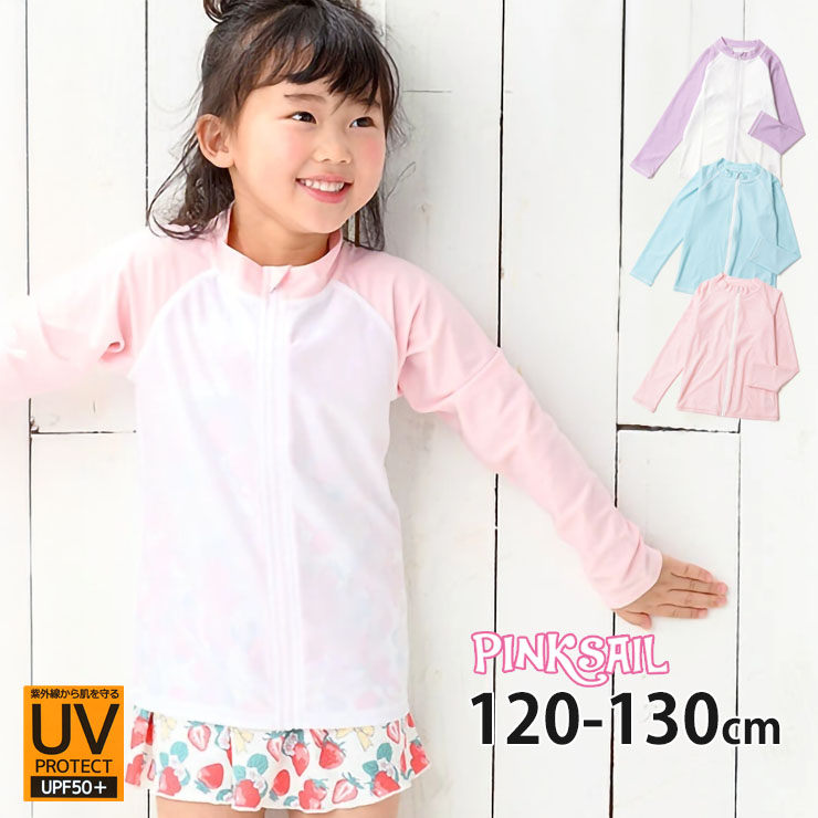 ラッシュガード キッズ 長袖 前あき ジップアップ フードなし UVカット パステルカラー 袖カラー 女の子 男の子 UPF50+ スイム 水着 フルジップ ファスナー 子供 子供服 小学生 PINKSAIL ピンクセイル 120 130 312801