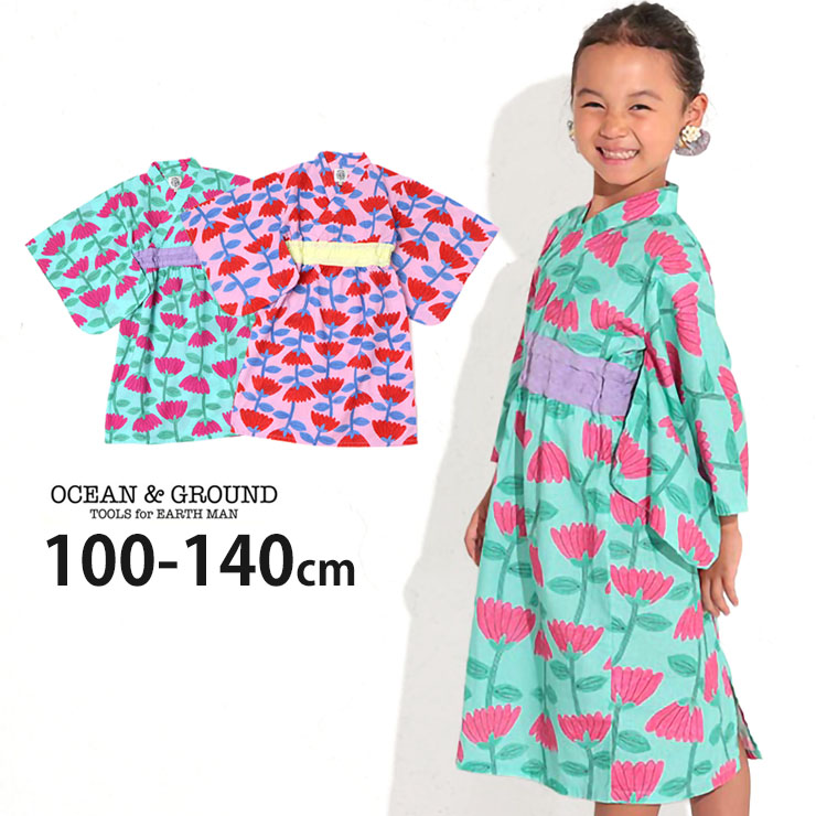 浴衣ワンピース ウエスト切替 花柄 浴衣風 簡単着付け 被り OCEAN&GROUND オーシャンアンドグラウンド 100 110 140 130 4412701 子供 女の子