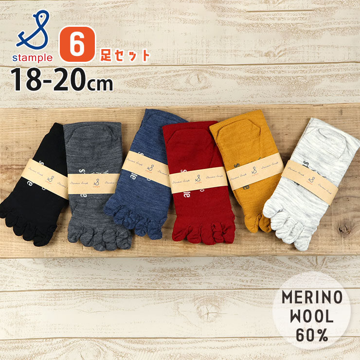 5本指クルーソックス 6足セット メリノウール60% 暖かい 6色セット 5本指靴下 子供用 STAMPLE スタンプル 18cm 19cm 20cm 72660-6pset 子供 男の子 女の子