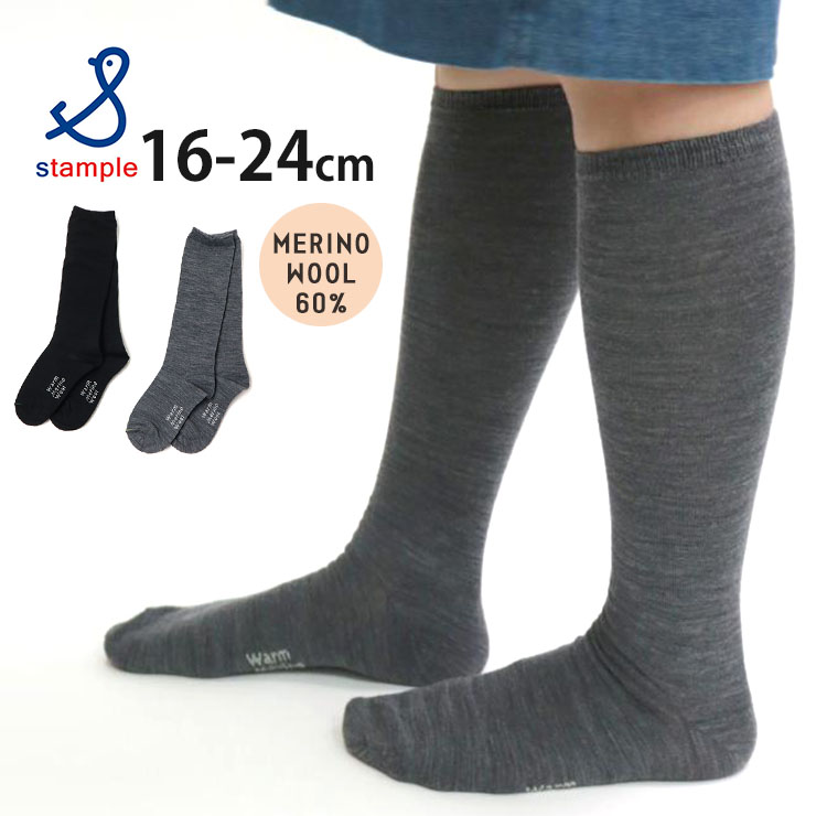 ハイソックス メリノウール60% 靴下 薄くて暖かい 無地 カラー 男の子 女の子 キッズ ジュニア 秋冬 薄手 あったか STAMPLE スタンプル 16-18cm 19-21cm 22-24cm 16cm 17cm 18cm 19cm 20cm 21cm 22cm 23cm 24cm グレー 黒 72663【メール便対象】