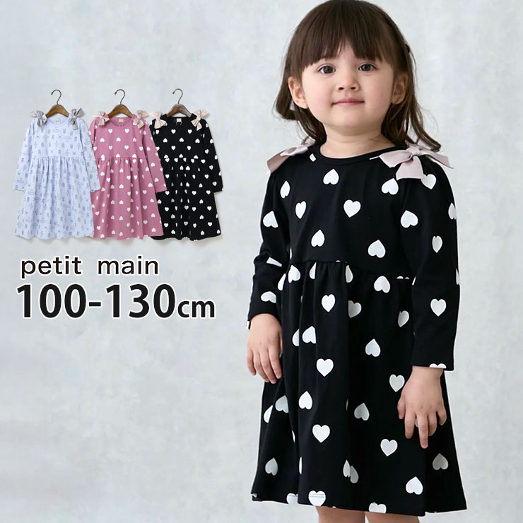 petit main 柄リボンカットワンピース 長袖 ハート柄 バレリーナ柄 ひざ丈 女の子 キッズ 春秋 綿100% カットソーワンピース 子供服 お出かけ プティマイン 110 120 130 ピンク 水色 黒 9653325【メール便対象】