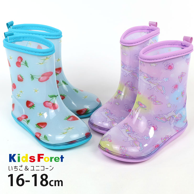 レインブーツ 長靴 いちご柄 ユニコーン柄 ゆめかわ 中敷きあり 女の子 キッズ レインシューズ レイングッズ 雨具 子供 子供用 保育園 幼稚園 小学生 Kids Foret キッズフォーレ 16cm 17cm 18cm 水色 紫 B81820