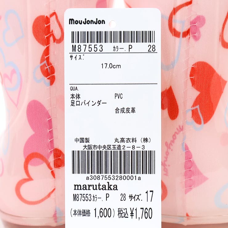 レインブーツ 長靴 中敷きあり ハート柄 レインシューズ moujonjon ムージョンジョン 16cm 17cm 18cm M87553 子供 女の子