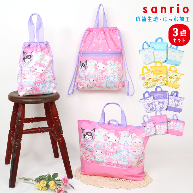 入園入学3点セット レッスンバッグ ナップザック シューズバッグ シナモロール シナモン ポムポムプリン クロミ サンリオキャラクターズ 女の子 キッズ 抗菌生地 撥水加工 鞄 巾着 子供用 保育園 幼稚園 小学生 通園 通学 san-001