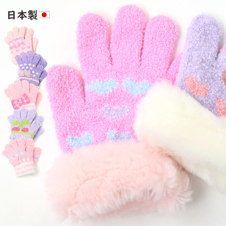5本指手袋 リボンモチーフ フラワーモチーフ ファー使い 女の子 キッズ 幼児 冬用 日本製 子供用 保育園 幼稚園 通園 かわいい 3歳 4歳 5歳 ピンク 紫 tmkn-11【メール便対象】