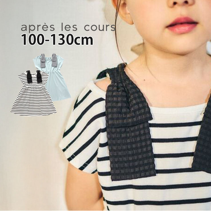 apres les cours フレンチスリーブワンピース 肩リボン フレア 無地 カラー ボーダー ひざ丈 綿100% 半袖 アプレレクール V317994 子供 女の子