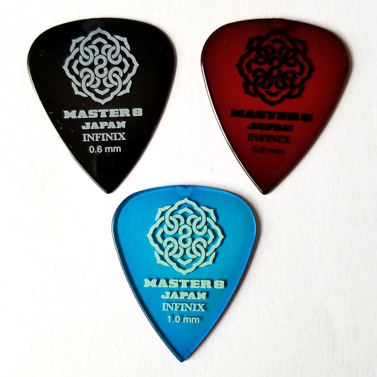 MASTER8JAPANが初めて世に放つ、次世代のピック新素材「INFINIX」。ギターピックに史上初めて採用した特殊プラスチックで柔軟性、形状記憶性、対磨耗性に優れており、ピックに使用されている通常のプラスチックに比べピックノイズが少なく、弦への吸い付きが非常に良い。磨耗に対しても強く、長時間の演奏でもピックが削れづらいので変わらないニュアンスでのプレイが可能。握り心地も鼈甲に近く指への密着性があるためグリップ力も高い。
