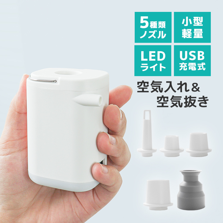| プールや浮き輪、エアーベッドなどの空気入れ・空気抜きに! 手乗りサイズなのにパワフルで使い勝手抜群です!! 充電式でどこでも使えます!持ち歩きもしやすい! この電動ポンプには5種類のノズルが付属してます。 アイテムに合わせてノズルを交換して使えます! また、3段階調光できるLEDライト機能付き! 吊り輪付きなのでキャンプのテント等で、ランタンとしても使えます。 他にも!モバイルバッテリー機能付きです。 各デバイス対応のケーブルを差して充電できちゃいます☆ 様々なシチュエーションで大活躍間違いなしです♪ 【商品仕様】 サイズ(約):5.5cm×7.8cm×4.1cm 重量(約):126g ノズルサイズ(約):4mm / 10mm / 13mm / 17mm / ゴムノズル ※ゴムノズルは他ノズルと組み合わせてご使用ください 【商品内容】 ポンプ本体、ノズル ×5種類、充電用USBケーブル |
