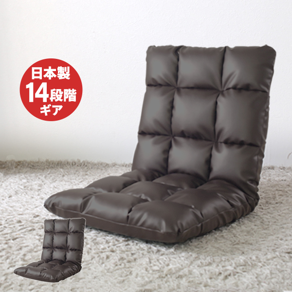 リクライニングチェア 座椅子 ダークブラウン レザー生地 ハイバック フロア ソファ へたりにくい 14段階調節 日本製ギア 北欧 コンパクト