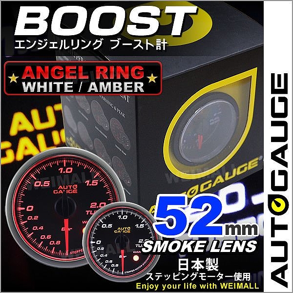 ブースト計 オートゲージ AutoGauge 52Φ エンジェルリング スモークレンズ ホワイト/アンバーLED ワーニング機能付 後付け メーター