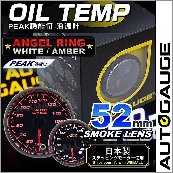 油温計 オートゲージ AutoGauge 52Φ エンジェルリング スモークレンズ ホワイト/アンバーLED ワーニング機能付 ピークホールド機能付 後付け メーター