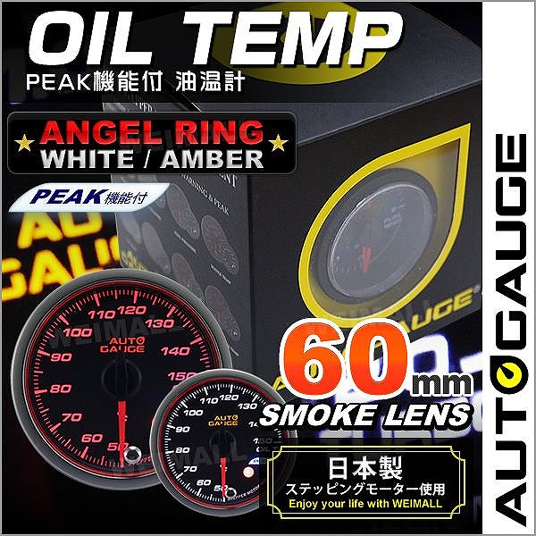 油温計 オートゲージ AutoGauge 60Φ エンジェルリング スモークレンズ ホワイト/アンバーLED ワーニング機能付 ピークホールド機能付 後付け メーター