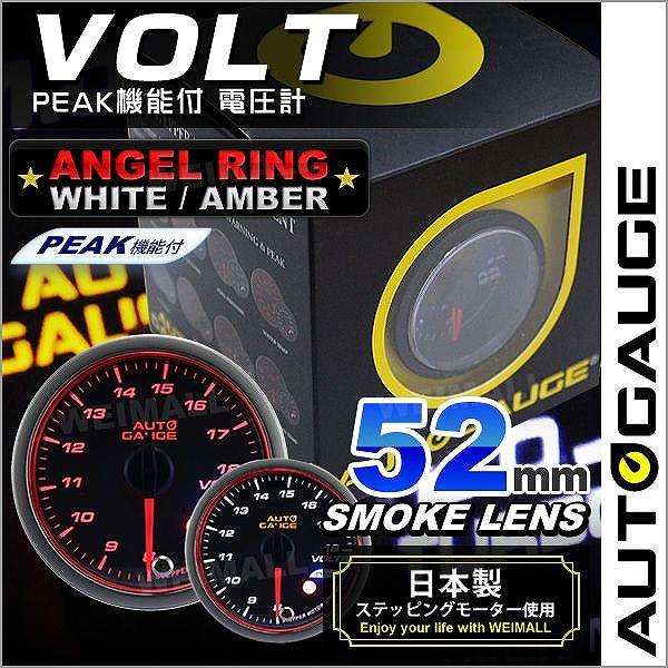 電圧計 オートゲージ AutoGauge 52Φ エンジェルリング スモークレンズ ホワイト/アンバーLED ワーニング機能付 ピークホールド機能付 後付け メーター