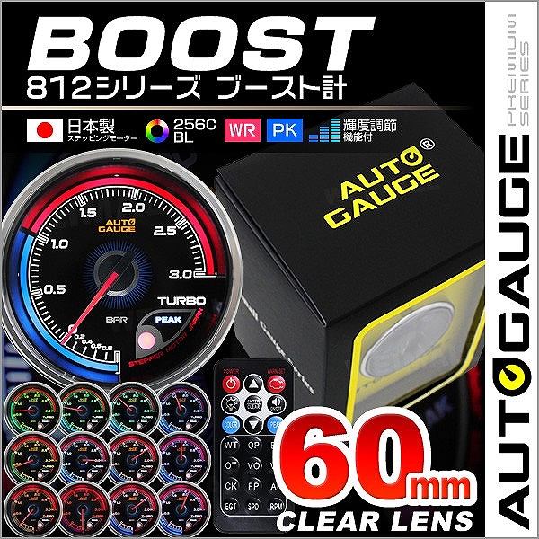 ブースト計 オートゲージ AutoGauge 60mm 日本製モーター仕様 クリアレンズ ワーニング ピーク機能 256色 リモコン付 後付け メーター