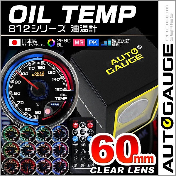 油温計 オートゲージ AutoGauge 60mm 日本製モーター仕様 クリアレンズ ワーニング ピーク機能 256色 リモコン付 後付け メーター