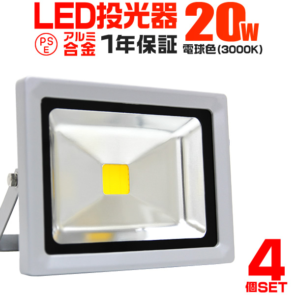 LED投光器 20W 200W相当 防水 作業灯 外灯 防犯 ワークライト 看板照明 電球色 4個セット 一年保証