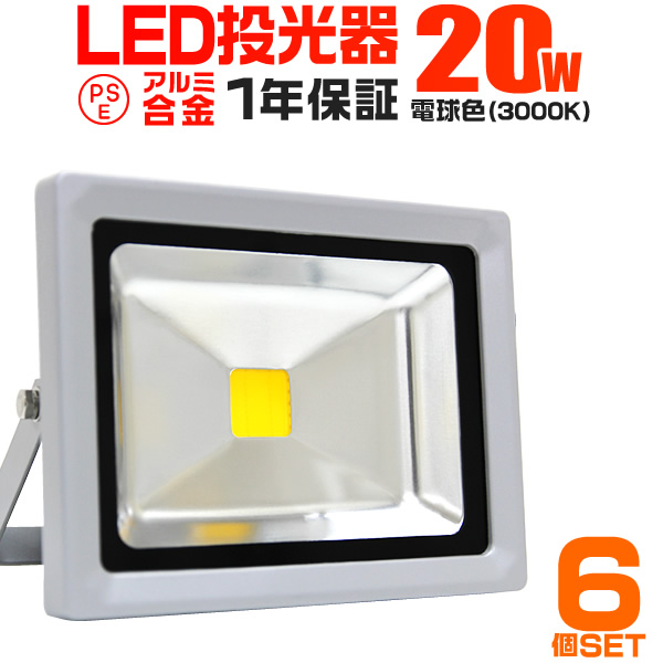 LED投光器 20W 200W相当 防水 作業灯 外灯 防犯 ワークライト 看板照明 電球色 6個セット 一年保証