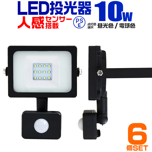 LED投光器 人感センサー 10W 100W相当 センサーライト 作業灯 外灯 防水 広角120度 3mコード付 昼光色 電球色 6個セット