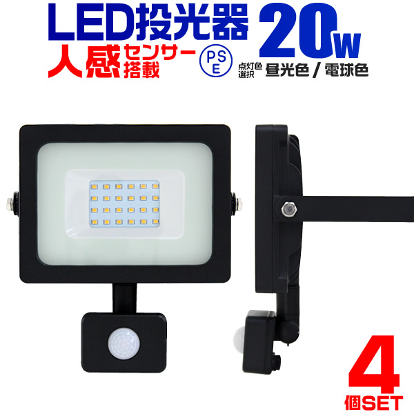 LED投光器 人感センサー 20W 200W相当 センサーライト 作業灯 外灯 3mコード付 4個セット