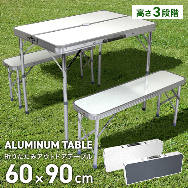 軽量アルミ製+取っ手付きで気軽に持ちだして、アウトドアやBBQにぴったりのテーブル&ベンチセットです。