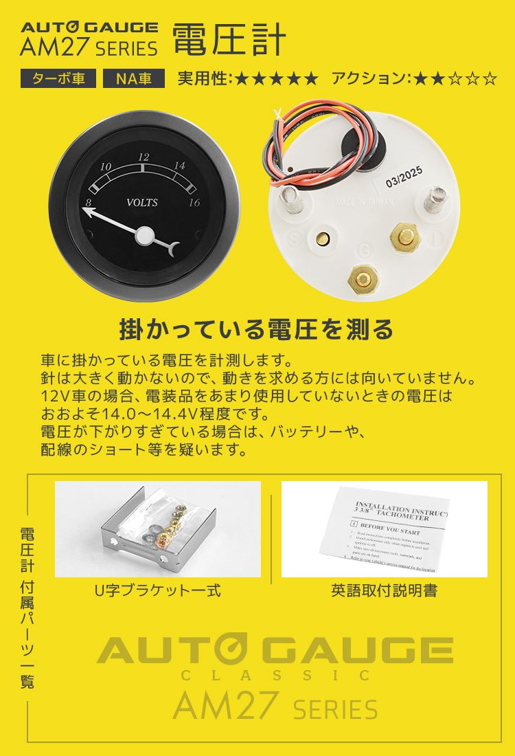 AUTO GAUGE(オートゲージ)AMシリーズの52mm電圧計は、シンプルで視認性に優れたクラシックデザインを採用した定番モデルです。