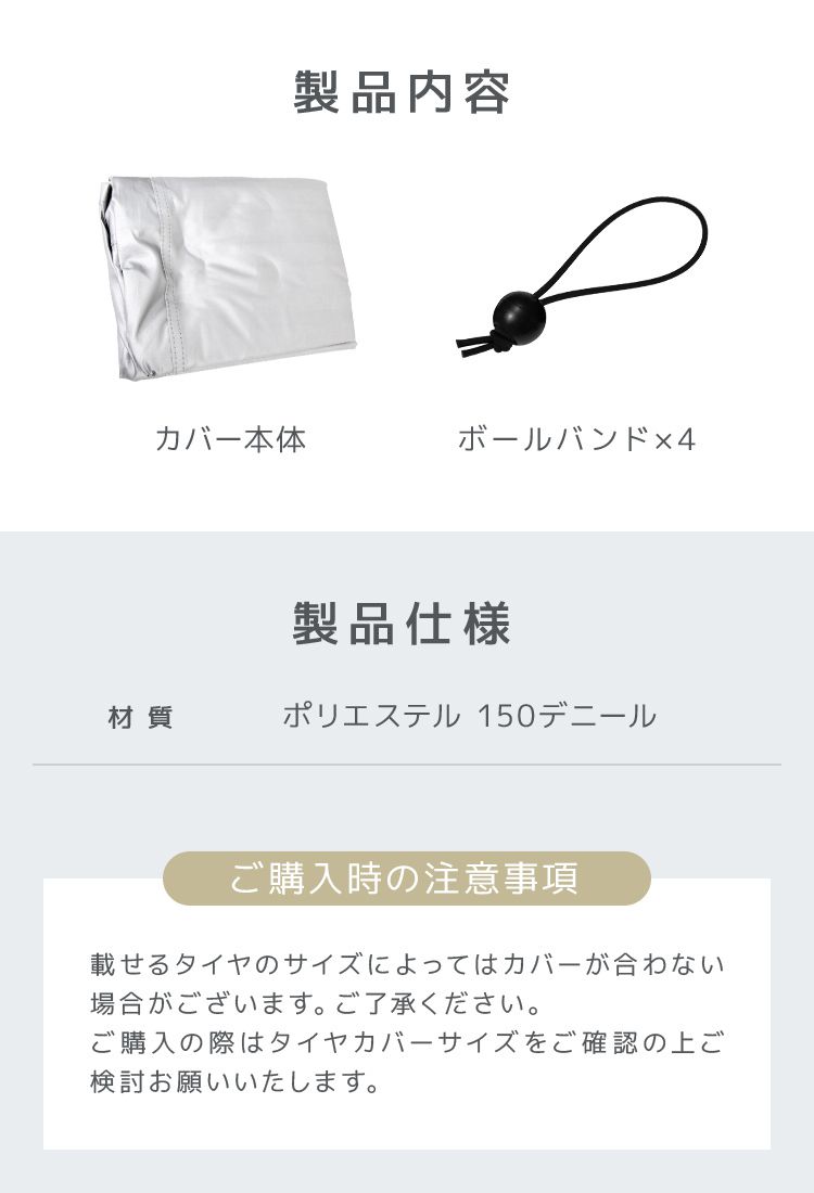 ・載せるタイヤのサイズによってはカバーが合わない場合がございます。ご購入の際はタイヤカバーサイズをご確認の上ご検討お願い致します。