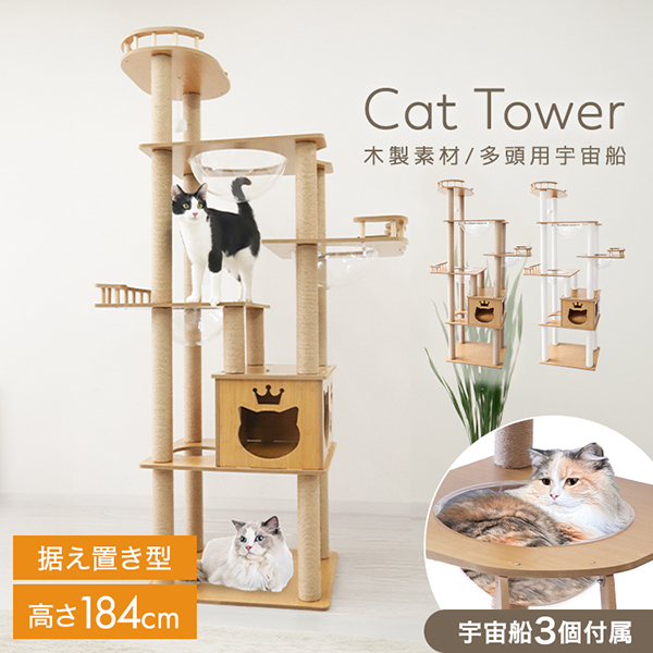 キャットタワー 木製 宇宙船 据え置き 爪とぎ 天然麻 スリム 大型猫 安定 滑り止め シニア おしゃれ 多頭飼い 隠れ家 展望台 省スペース 猫 見晴台 クリアボウル